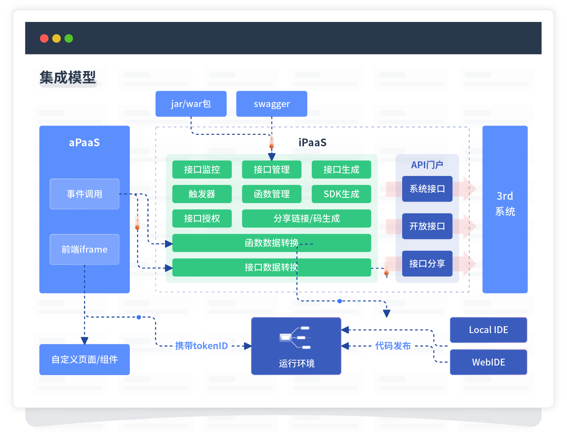 集成模型包括平台本身前、、后端能力的扩展,,也支持通过API门户和第三方系统进行交互。。。。