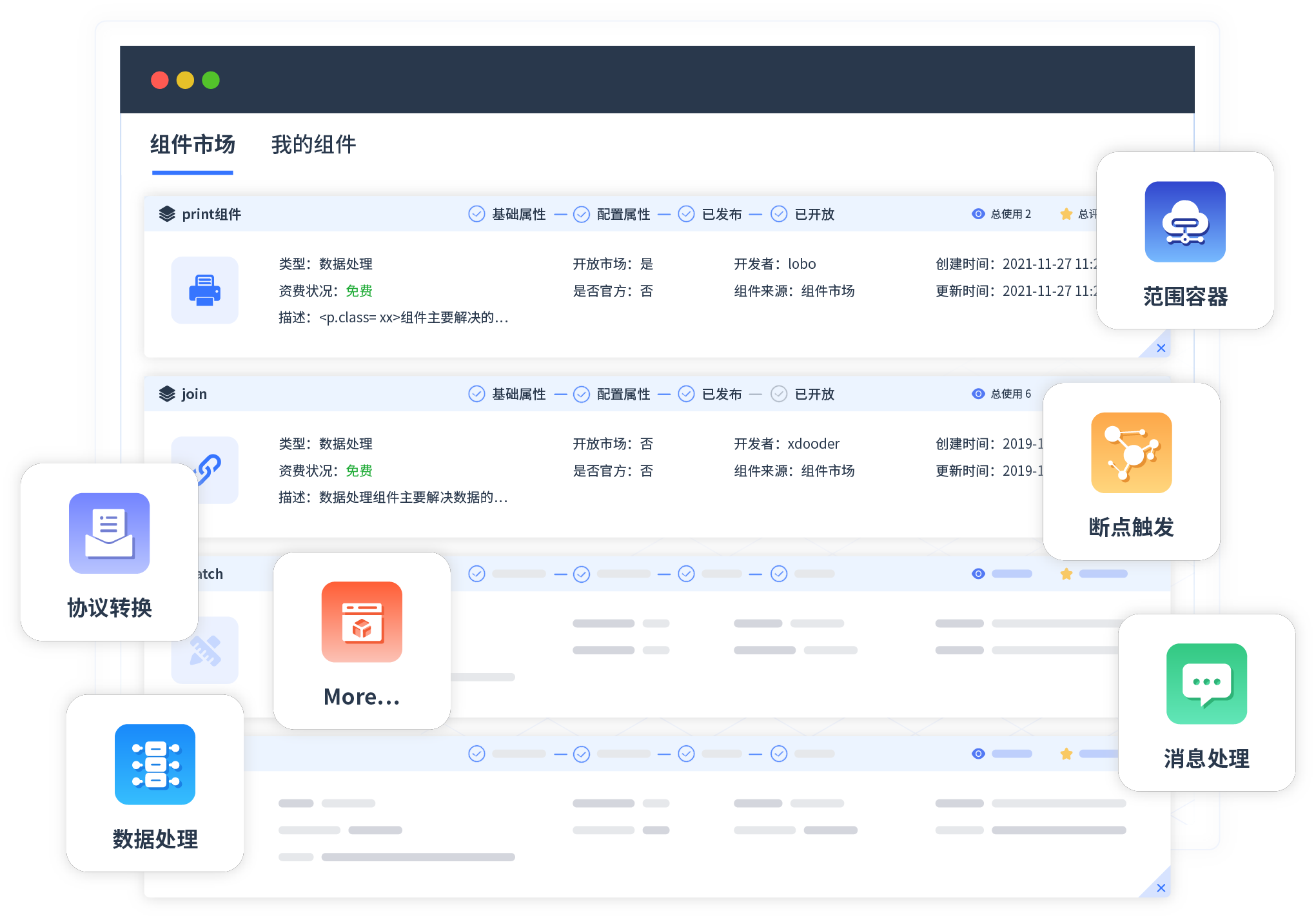 针对集成场景,,,沃钱包提供组件市场,,例如协议转换、、、消息处理、、文件操作等。。。除平台提供的组件外,,客户可以自定义所需组件。。。