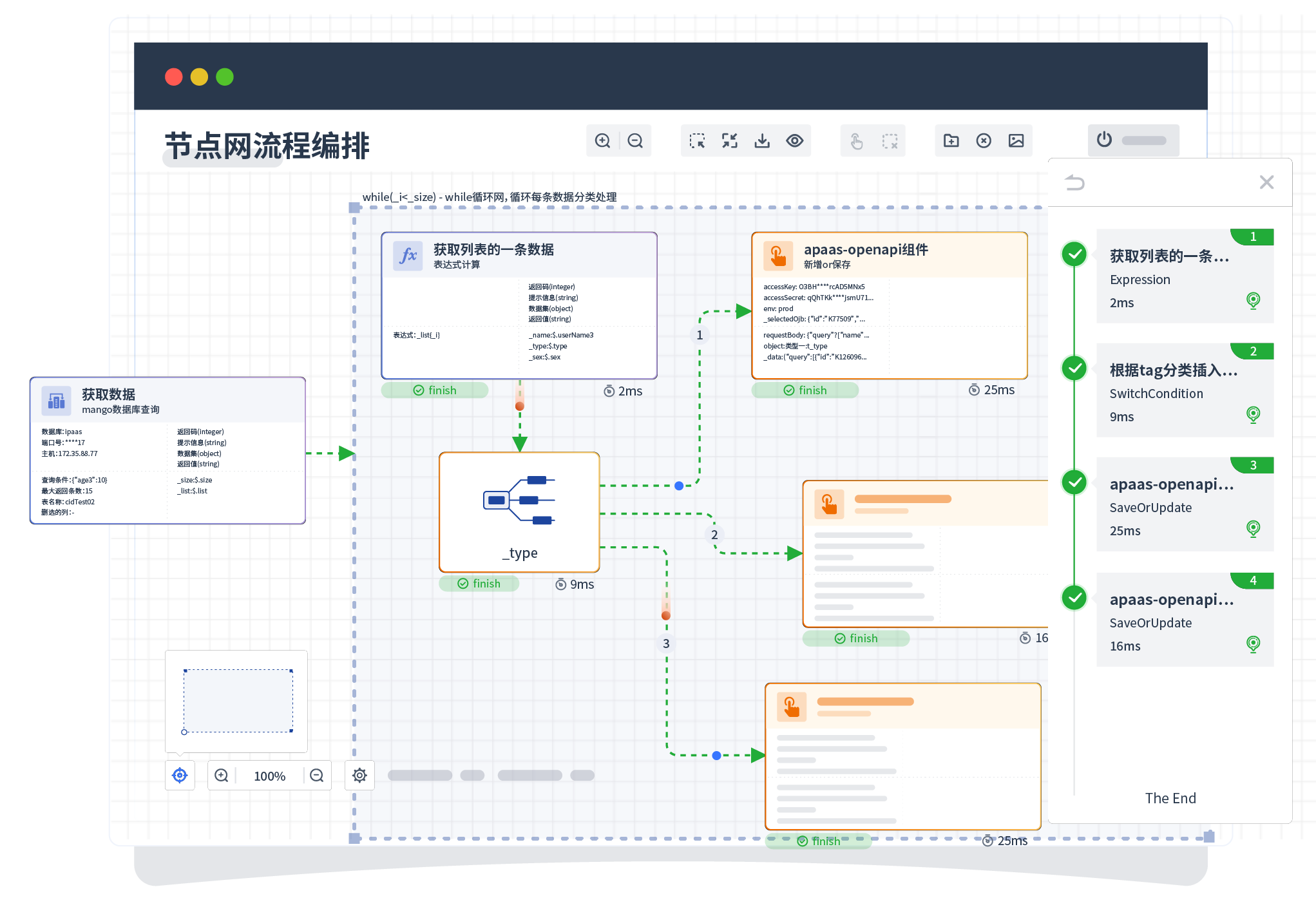 针对集成场景,,,,组件定义后支持进行流程编制,,,不同于传统代码方式,,通过图形化展示,,支持在线调试、、、日志查看和运行回放。。。。