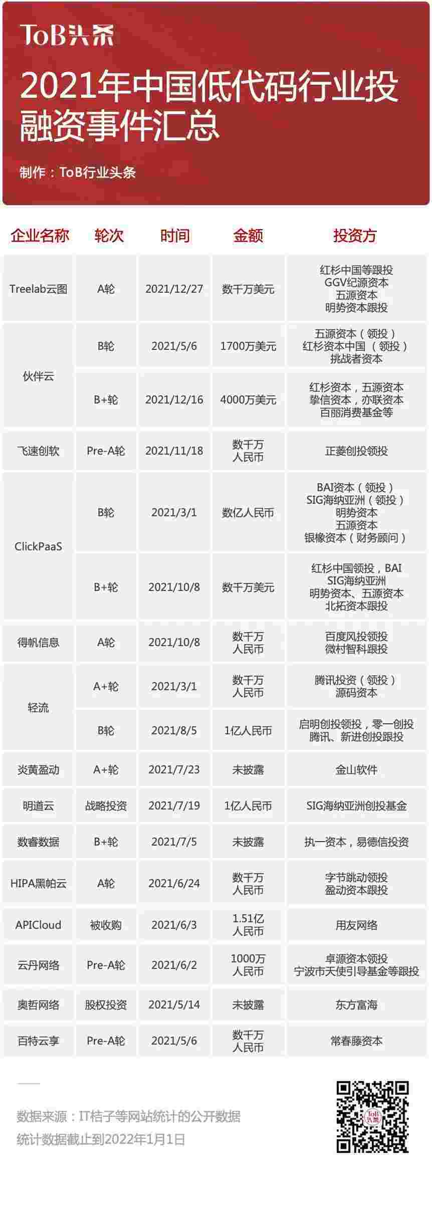 到2021年,,,无/低代码投融资规模势头更甚,,,,其中包括轻流两轮融资(A+轮数千万人民币,,,,B轮近亿人民币)、、、、沃钱包 两轮融资(B轮数亿人民币,,,B+轮数千万美元)、、百特云享数千万元Pre-A轮融资......