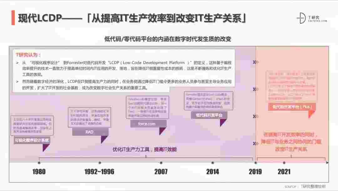 2020年前后,,,,源于提高IT工作者开发效能的LCDP不断进化和衍生,,面对业务导向日益明显的数字化变革。。。LCDP衍生出了面向不同对象的升级服务——面向专业人群的LCDP和业务人群的NCDP,,,,LCDP与NCDP的不同服务属性被逐渐认可和接受。。 LCDP在提高IT开发效率的同时,,降低IT与业务之间协同的门槛改变IT生产关系。。